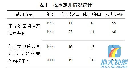 前幾年某單位在水文地質領域剛起步,經驗不足,找水主要依靠物探工作,片面追求效率,急于求成,效果很不理想。后來意識到了基巖裂隙水地區水文地質調查工作的重要性,及時調整了思路,加強了這方面的工作力度,取得了比較好的結果。近幾年來基巖裂隙水地區定井成功率見表1。