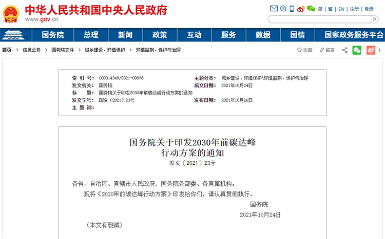 國(guó)務(wù)院關(guān)于印發(fā)2030年前碳達(dá)峰